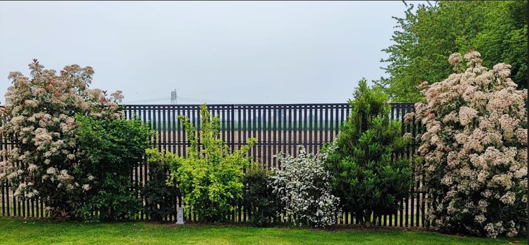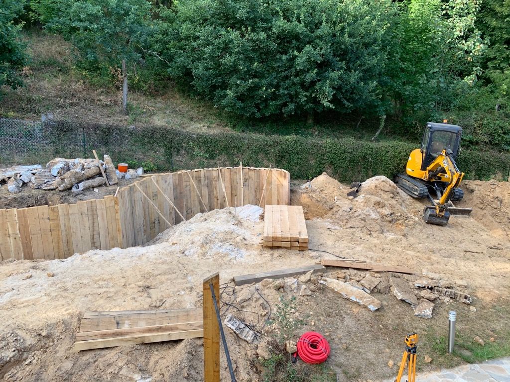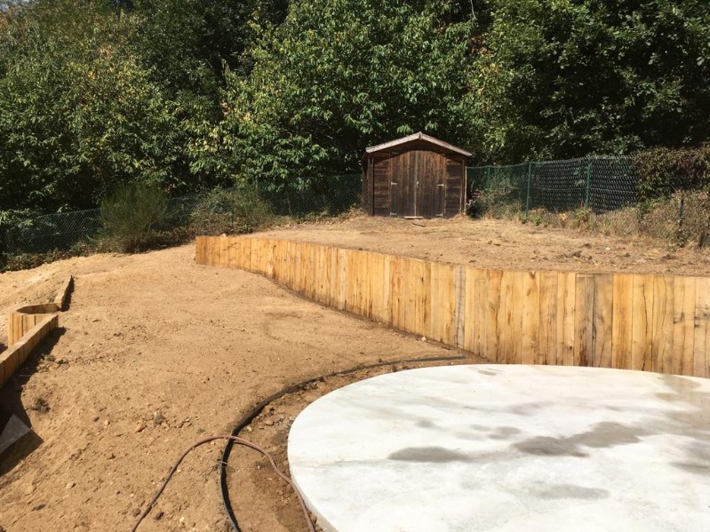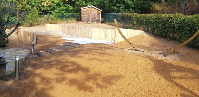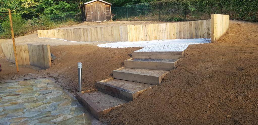 Travaux de terrassement, avec soubassements en traverses de bois, escalier en bois et clôture avec haie variée libre.